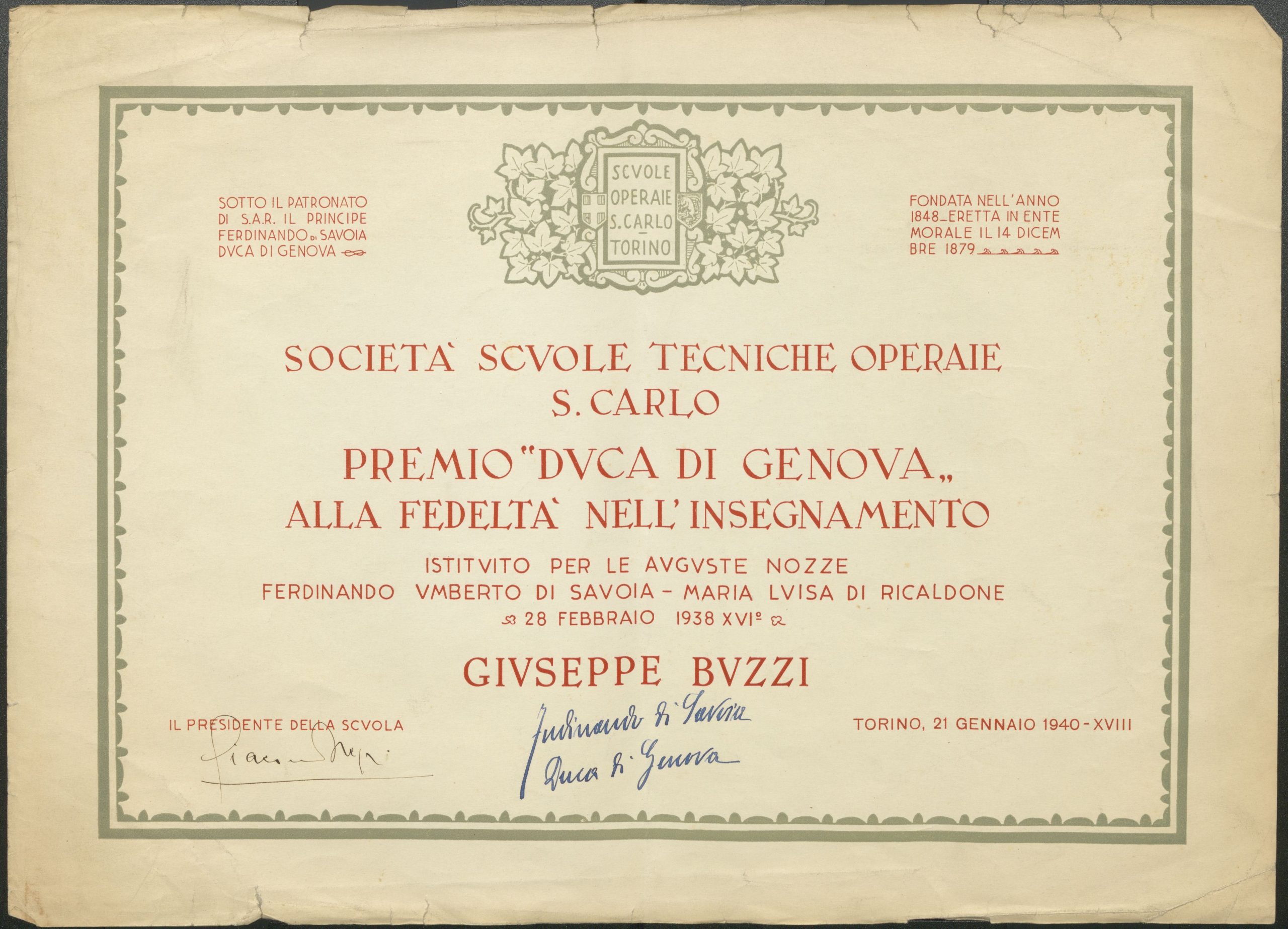 Attestato “Premio Duca di Genova alla fedeltà nell’insegnamento”